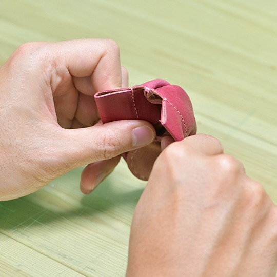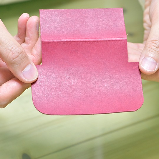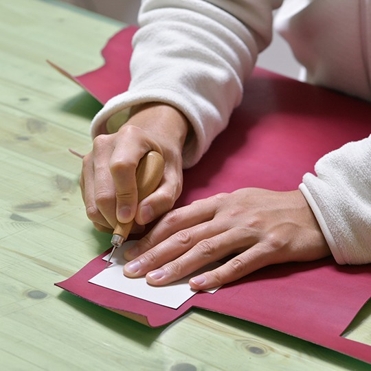 型紙通りに革に転写していきます。仕上がりを良くするために、なるべく柔らかい背中からお腹にかけた部分を使うと作りやすいです。ただ、最後に表裏を反転させるため、パーツ取りの段階で繊維が伸びる方向まで注意しましょう。また、厚い革を使うと開閉バネの操作がぎこちなくなったりするため、革を漉かない場合は0.8〜1.0mmの革を使うときれいに仕上げることができます。