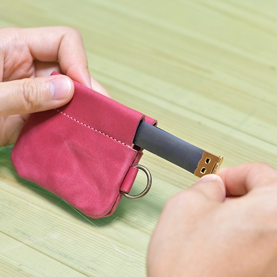 開閉バネを固定するピンは手で差し込めないくらい硬いです。ピンを差し込む際には、金具の下側をカッターマットなどで押さえて上から木槌で叩いて差し込みます。一度差し込むと2度と抜けないくらい硬いので挿入向きに注意してください。
