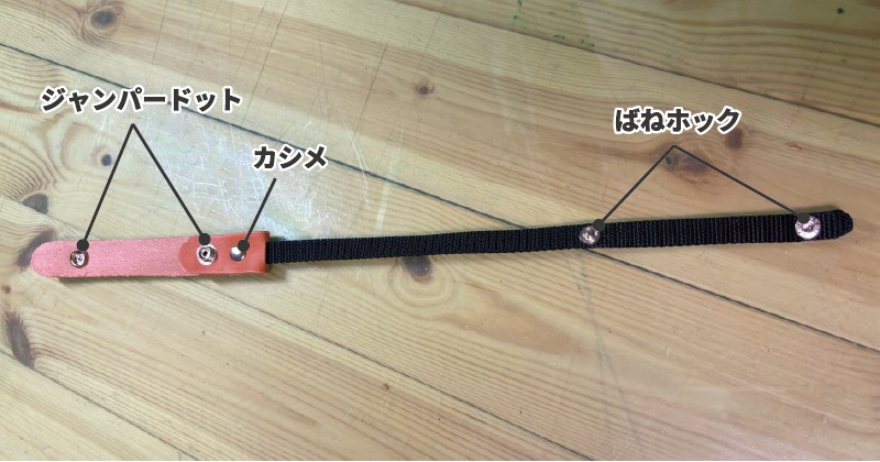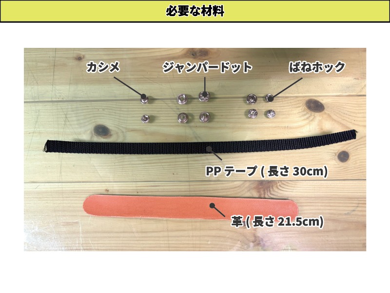 以下の写真のパーツを用意してください。革の方にはジャンパードットを使っていますが、これはバッグやベビーカーなどにしっかりと固定させるためです。一方、今回使用したPPテープの幅は12mmであるため、それに合うものとしてばねホックを使用しています。金具の色や種類はお好みに合わせて使用してください。