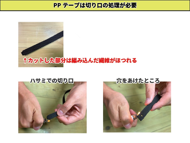 PPテープを30cmの長さに切ります。次にハトメ抜きの上から木槌で叩いて穴をあけます。PPテープを切断すると編み込まれている繊維がボロボロとほどけてくるので、ライター等で少し炙ります。溶けたPPテープは非常に熱いのでやけどに注意してください。また、出てくる煙は吸わないように十分に換気をして作業してください。
