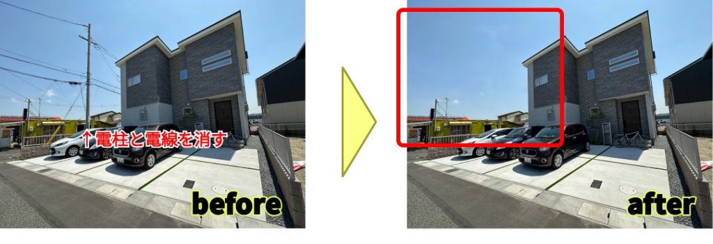 写真の中の不要なものを消すことができます。どうしても電線に目がいってしまう写真でも簡単に電柱や電線を消すことができます。