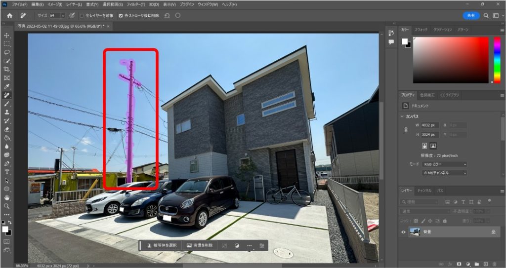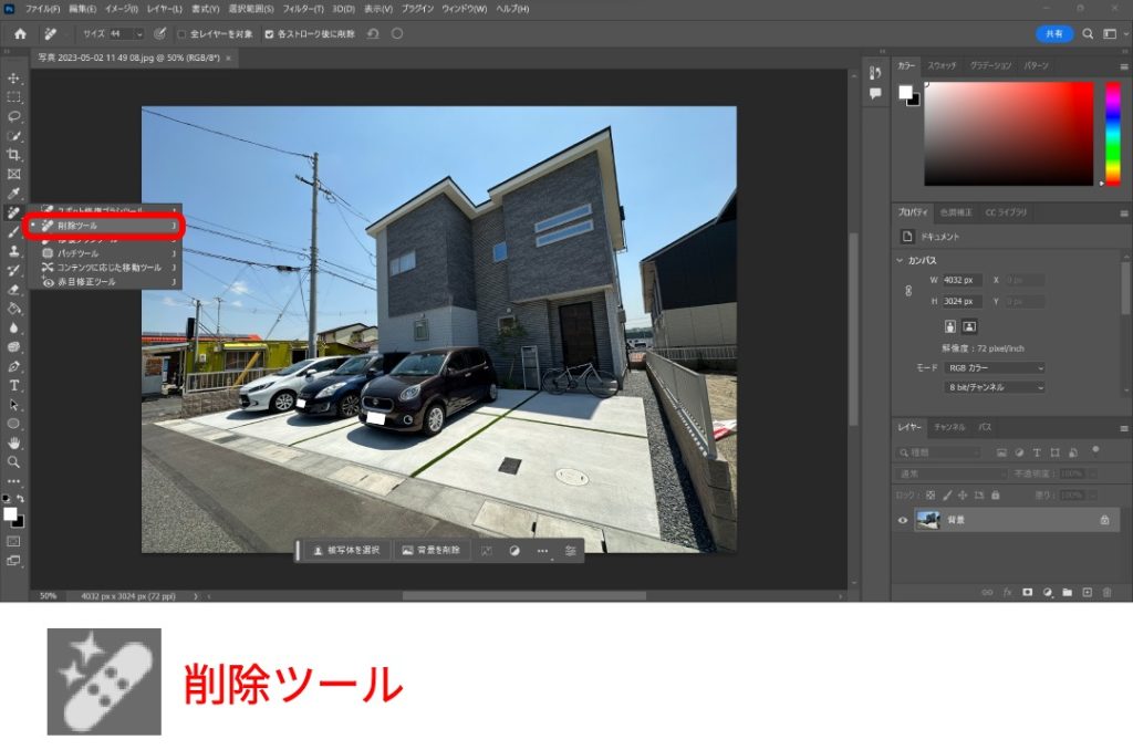 Photoshopの『削除ツール』を使うとドラッグしてなぞるだけで簡単に削除できます。AI機能が搭載されているということで、かなり自然に消してくれます。不要なものを消すことができるコマンドはいくつかありますが、今回は削除ツールを紹介します。