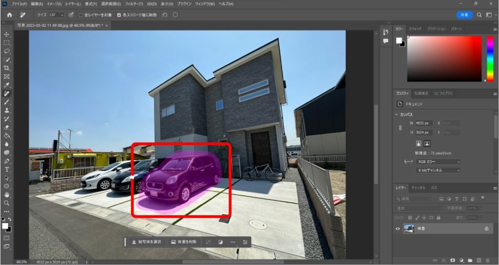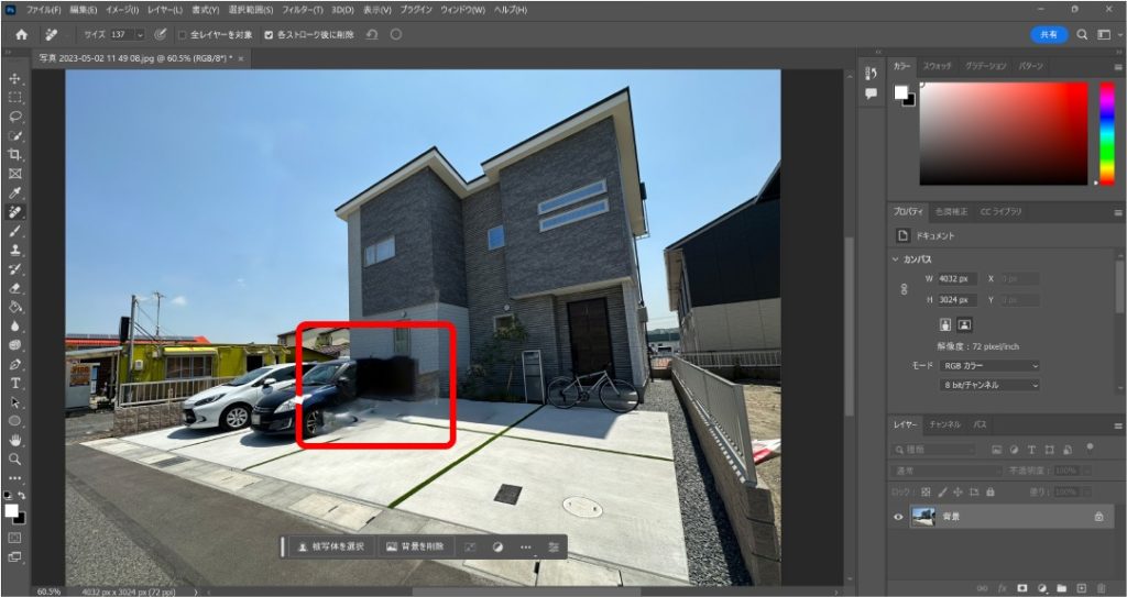 建物前にある車を消してみたいと思います。車が消えて一瞬うまくいったような感じもしますが、真ん中の車の後ろ半分がうまく生成できていません。自分が背景を想像して描けないものはこの機能を使っても削除できないという感じで使用することが大切です。