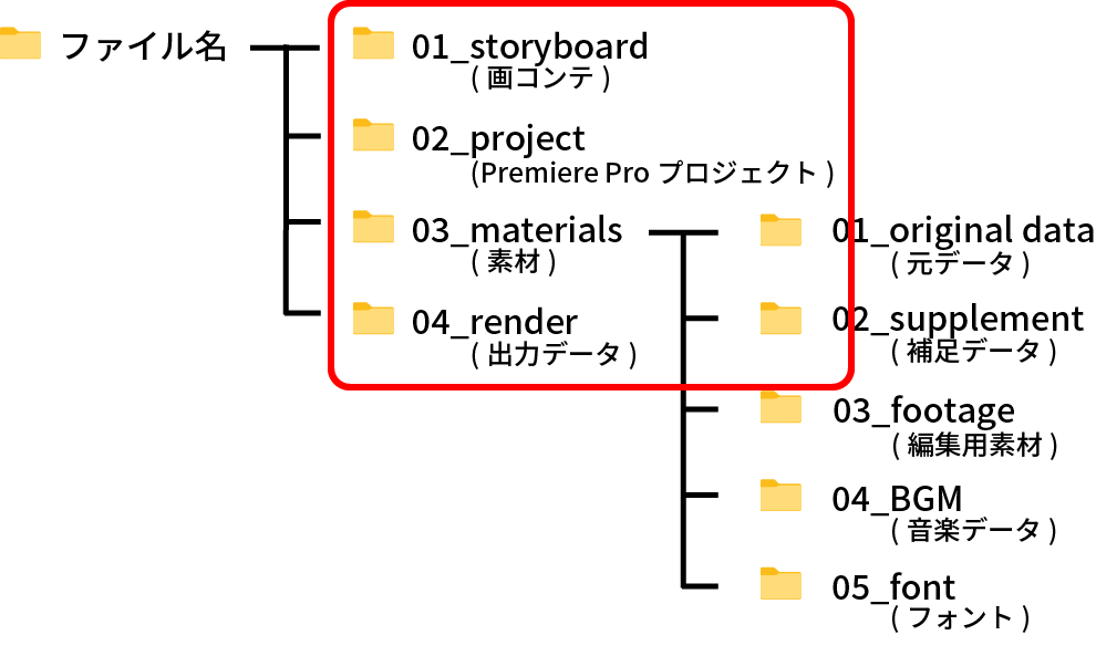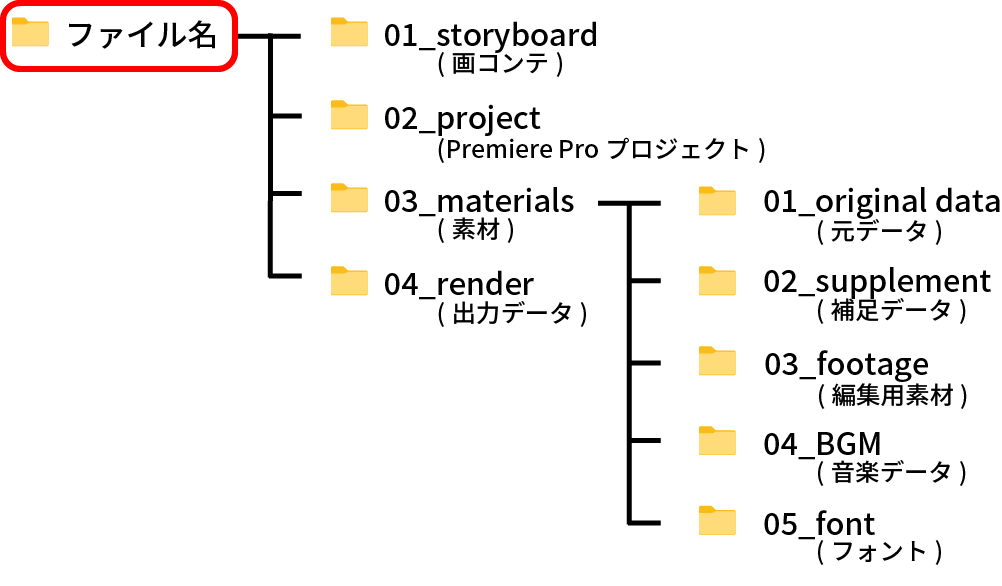 全体のファイル構成は、下図のようにフォルダをカテゴリーごとに分類して管理していきます。動画を作っていくと、作った動画の分だけファイルが増えていきます。そこで、過去に作成した動画が時系列に並んで内容が分かるような名前をファイル名に付けることで過去の動画の管理がしやすくなります。フォルダの階層は階層が深くなると管理が大変になるので、3階層までで管理することをお勧めします。それでは階層ごとに説明します。
